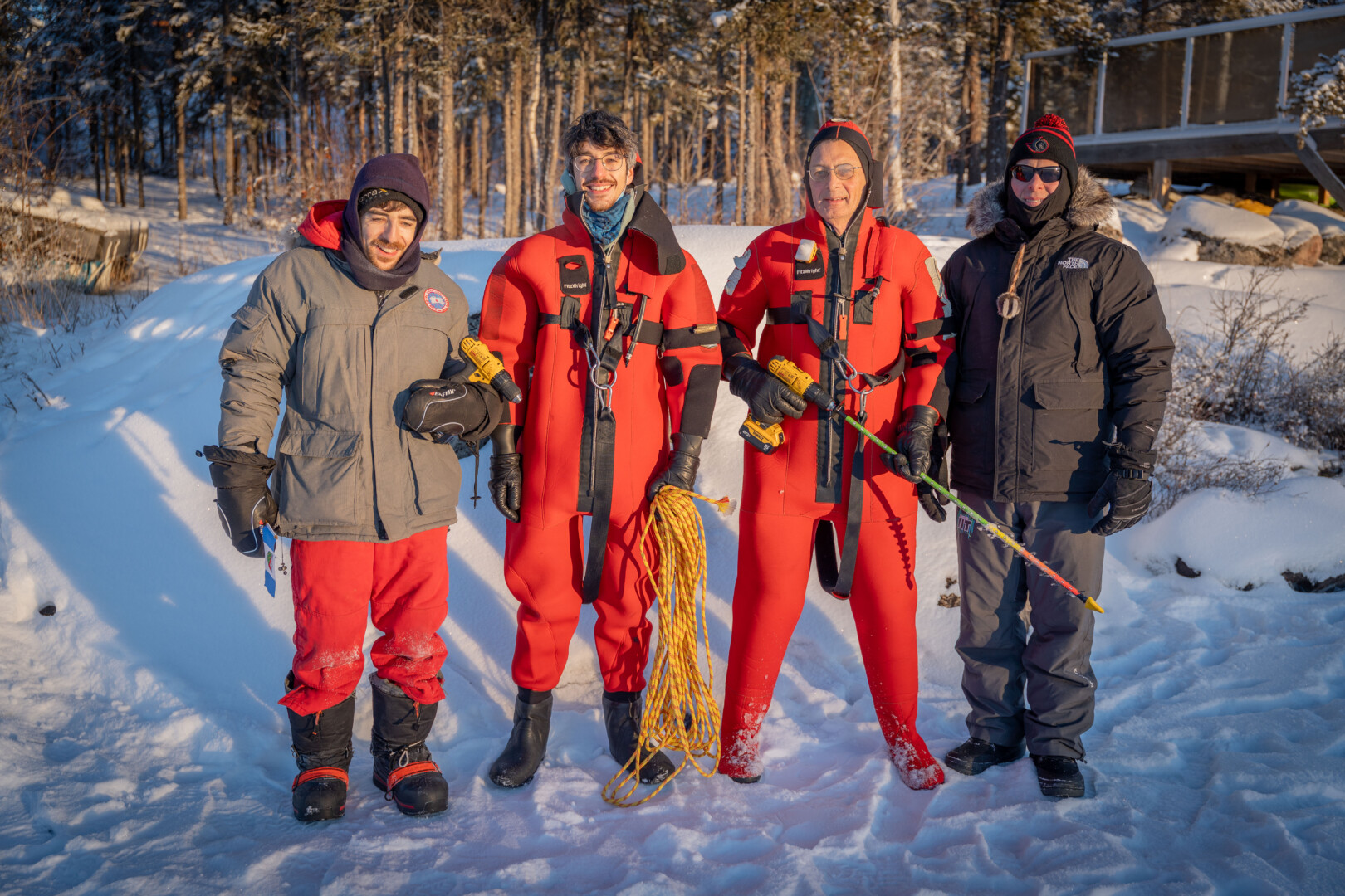 Les bénévoles Loïc Fauvel-Burns, Ewen Fauvel-Burns, Mike Burns et Randy Caines lors de la tournée de mesures sur les lacs de Yellowknife.