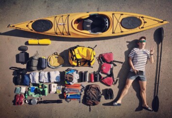 Thomas Destailleur avec son kayak et tout son équipement, prêt à poursuivre son expédition.