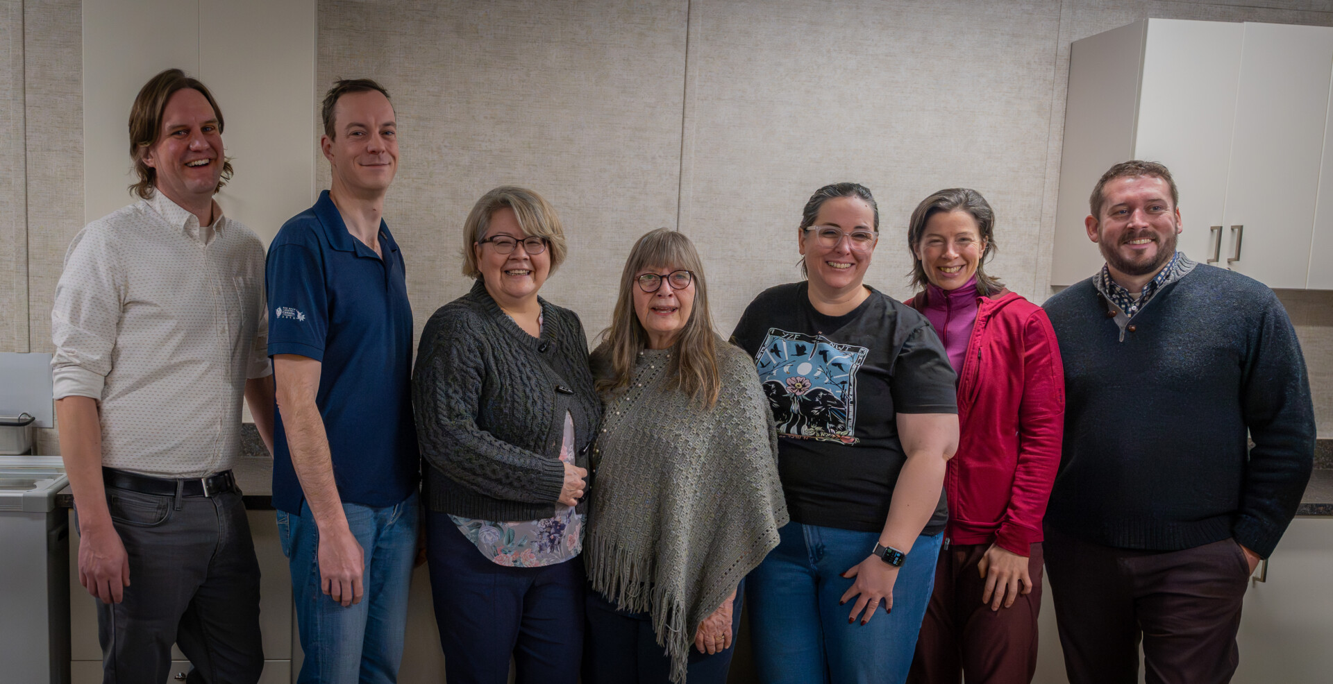 De gauche à droite : le maire Ben Hendriksen, le député Kieron Testart, la ministre du Logement Lucy Kuptana, la directrice de la Yellowknife Women’s Society Arlene Hache, ainsi que les députés Kate Reid, Shauna Morgan et Julian Morse lors de la visite du 4 décembre.