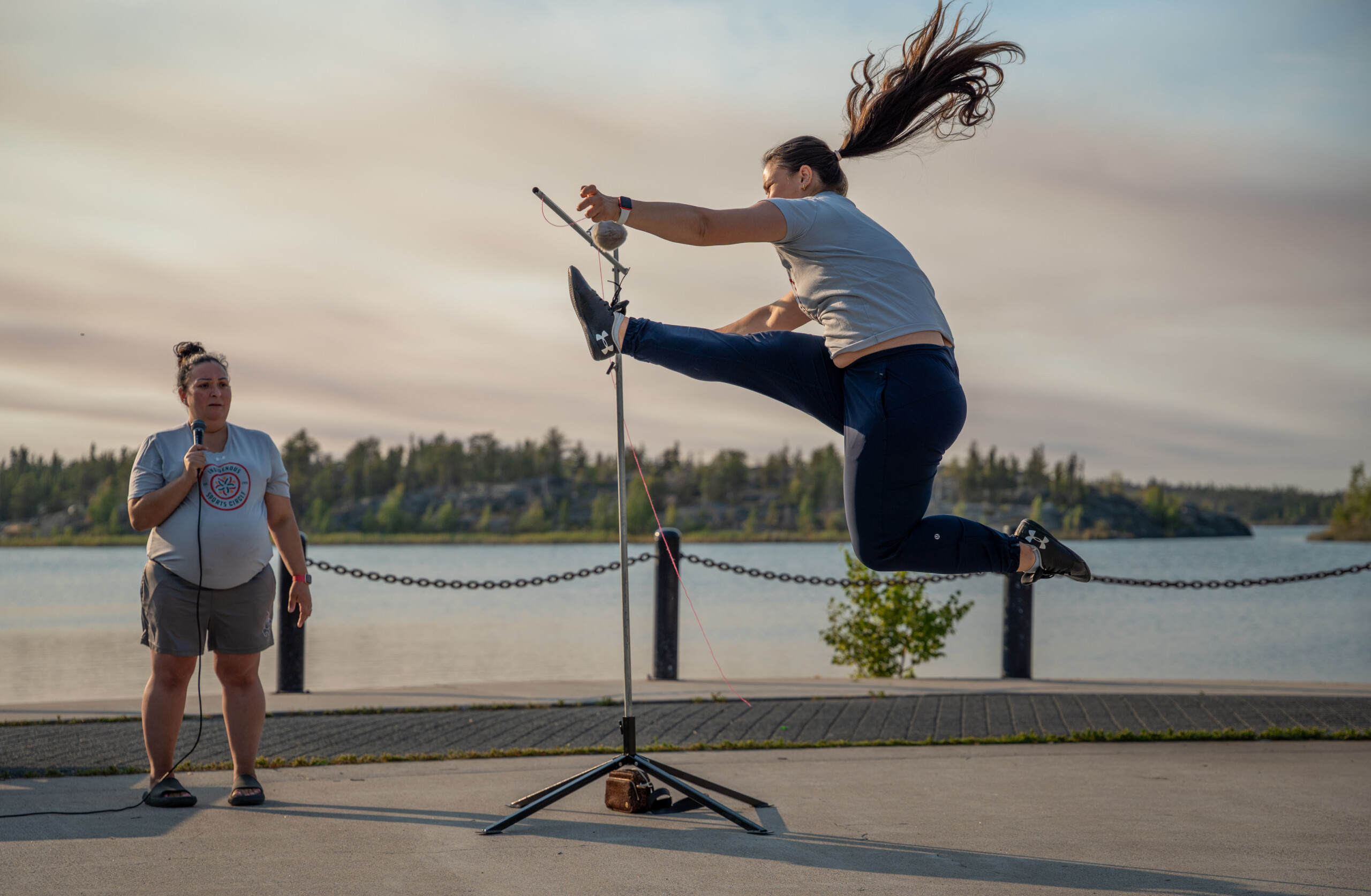 Le 26 aout, la communauté francophone et ses partenaires ont accueilli les nouveaux arrivants à Yellowknife lors d’une soirée festive au parc Somba K’e. Tambours dénés, activités familiales et rencontres communautaires ont rythmé cette cinquième édition de la Journée d’accueil. Une participante exécute le one foot high kick lors de la démonstration de jeux nordiques.