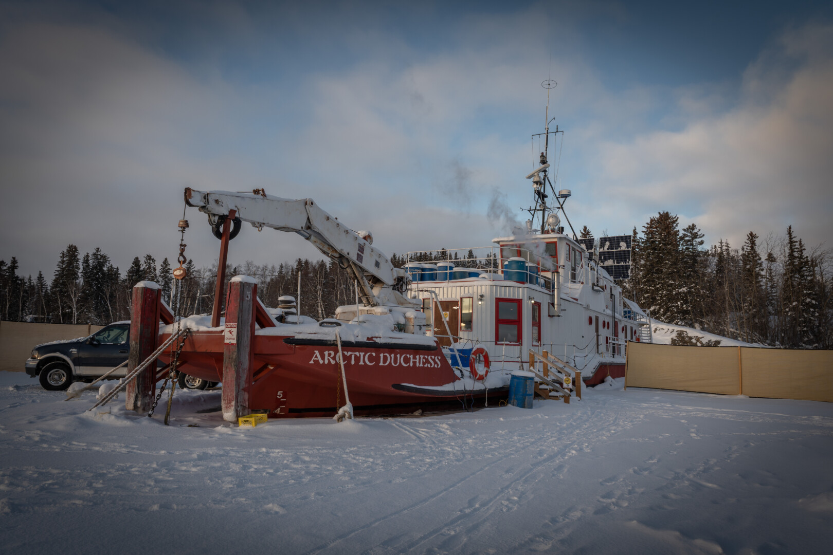 L’Arctic Duchess, ancien navire de la Garde côtière canadienne construit en 1961, est aujourd’hui amarré sur le Grand lac des Esclaves et sert de point d’ancrage aux activités d’Arctic Duchess Adventures