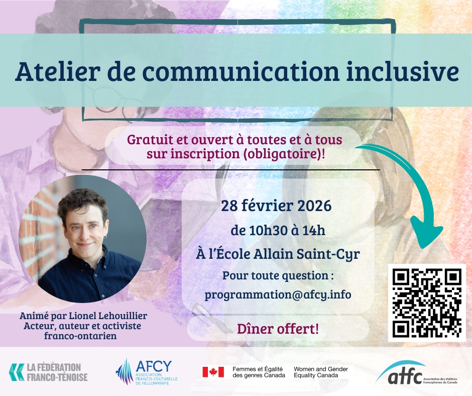 Artiste de la région d’Ottawa-Gatineau, Lionel Lehouillier est comédien, auteur et metteur en scène, mais aussi facilitateur et consultant en diversité de genre et inclusion. En tournée dans les trois territoires, iel fera escale à Yellowknife pour offrir un atelier d’écriture inclusive à l’invitation de l’AFCY et de la FFT. « J’ai toujours voulu visiter Yellowknife. Quand on m’a proposé d’enchainer les trois territoires, c’était une occasion parfaite », confie-t-iel, impatient de rencontrer les artistes locaux. L’accompagnement et le coaching d’artistes professionnel.le.s font partie de ce qui l’anime le plus dans cette tournée : « J’ai hâte de voir leur pratique, ce qui bouillonne ici. »